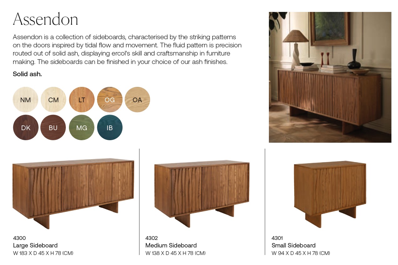The Assendon sideboard takes inspiration from tidal flow and movement, creating a fluid pattern within the ash timber. The wood is softly sculpted giving a sleek look to any room. The large sideboard has four doors all with a push opening/closing mechanism to maintain clean lines, giving you ample storage while keeping your room organised and stylish. A Medium and a Small sideboard offer the same elegant storage solutions! These sideboards all have an adjustable shelf and cable management holes in the centre of each cupboard. Available in all Ercol ash finishes.