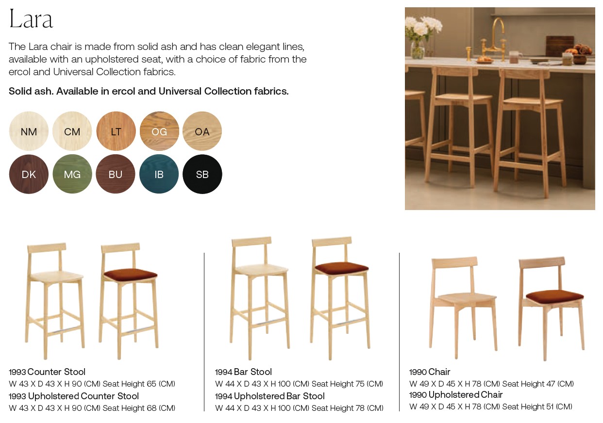 The Lara Dining Chair is made from solid ash and has clean elegant lines. Boasting a steam-bent backrest, crafted details and a shaped solid wood seat makes this chair a perfect pairing for any dining setting or just as an occasional chair. Why not also team your dining chairs with matching Bar or Counter stools? With a choice of two seat heights, Lara allows you to not only find the best bar stool for your breakfast island, but also promotes continuous flow from the dining space into the kitchen area. Lara is available in a selection of wood finishes, and is available with an upholstered seat, with a choice of fabric from the Ercol and Universal fabric collections.
