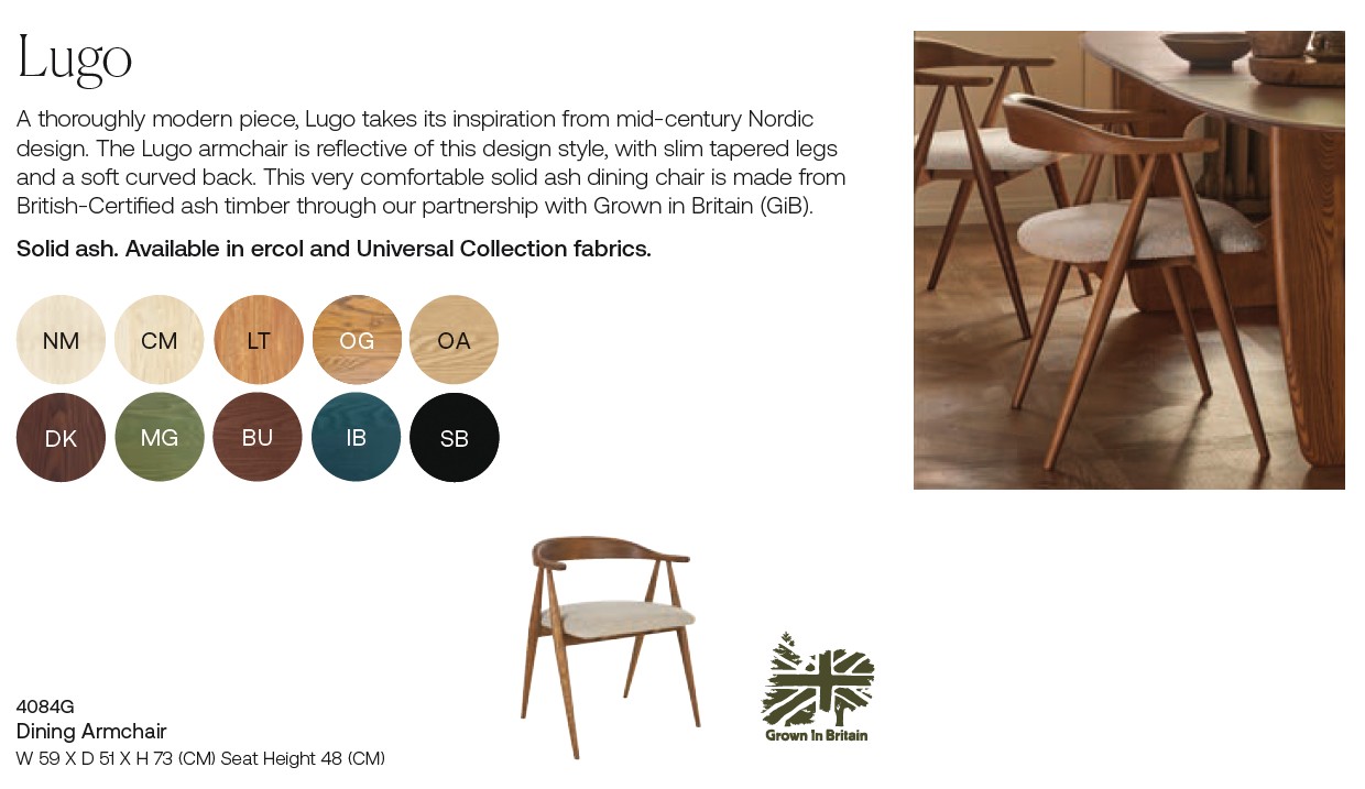 The Lugo Dining Chair is made exclusively of Certified-British homegrown timber (GiB). A thoroughly modern chair, Lugo takes its inspiration from mid-century Nordic design, with beauty, simplicity and functionality at its core. The Lugo Chair is a reflection of this design style, with slim tapered legs and a soft curved back this very comfortable solid ash dining chair really is a statement occasional piece. The Lugo Chair sits perfectly with any of Ercol's ash-wood dining tables as it is available in the same selection of finishes and paint colours. You can choose your seat cushion fabric from any within the Ercol or Universal fabric collections.