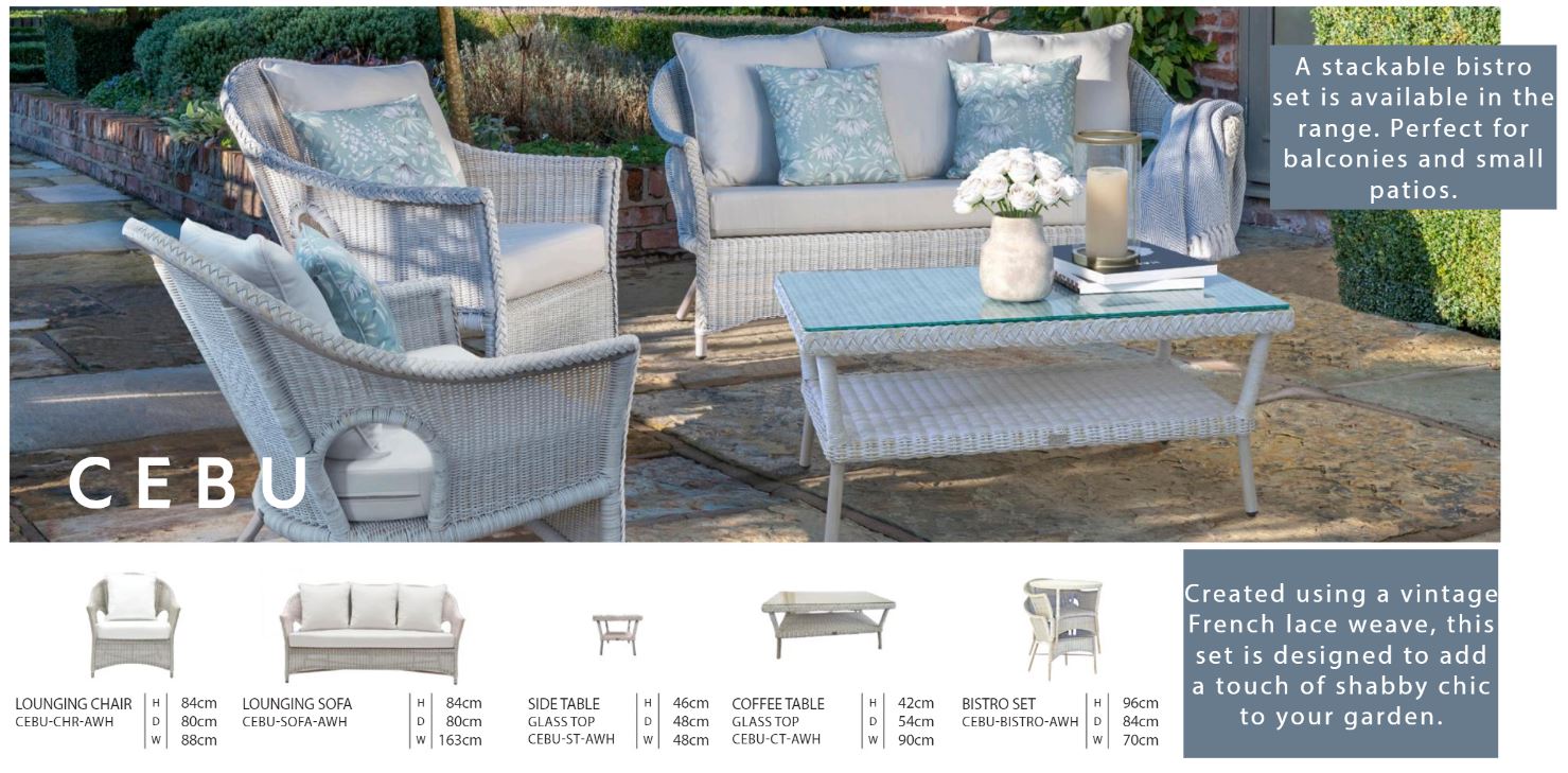 A timeless, practical and elegant design, ideal for smaller gardens or terraces. The Cebu Bistro Set has been handcrafted in a Antique White Wash 3mm Vintage Lace weave, adding a touch of “shabby chic” to your patio, veranda or balcony. This range has been created with small spaces in mind –  the chairs are lightweight and stackable, making it easy to pack away and store when not in use and the table has been designed to comfortably seat two people with a glass top for practicality and a shelf underneath for extra storage and added support. Choose from a stunning collection of fabrics for upholstering the Dining Seat Pads to suit your style and taste.