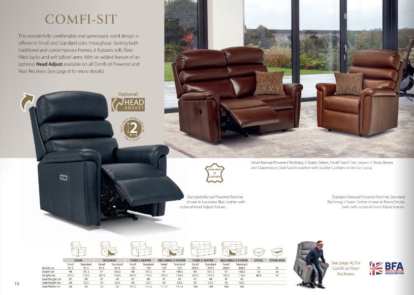 • All Comfi-Sit sofas and chairs are available in 2 different sizes: 'Small' and 'Standard'. This allows you to find the perfect size chair or sofa for you! It also makes it possible for a couple or a family to have their own seats, whilst still having all furniture match as part of a suite.