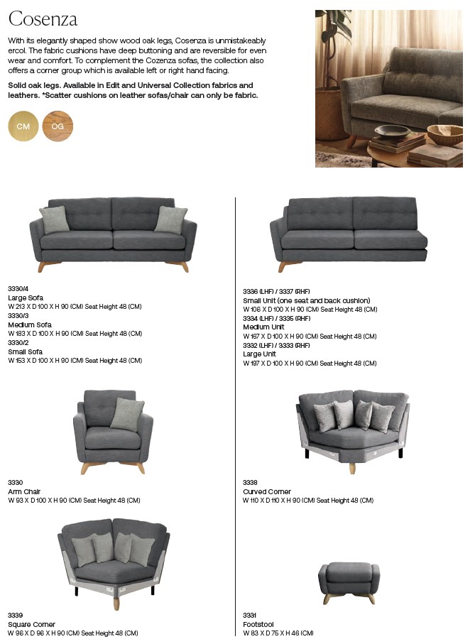 A stylish upholstery collection with retro undertones, deep buttoning in the back cushions creates design appeal and comfort. Cushions are reversible for even wear and comfort. The Cosenza model, as with the rest of the Ercol upholstery collection, incorporates show wood oak legs in the under frame. This collection is comprehensive, with modular corner configurations also available. Cosenza blends the modern - versatile and family-friendly fabrics - with the retro - button-back cushions and chunky wooden legs. The upshot of this is that Cosenza works perfectly in almost all styles of home!