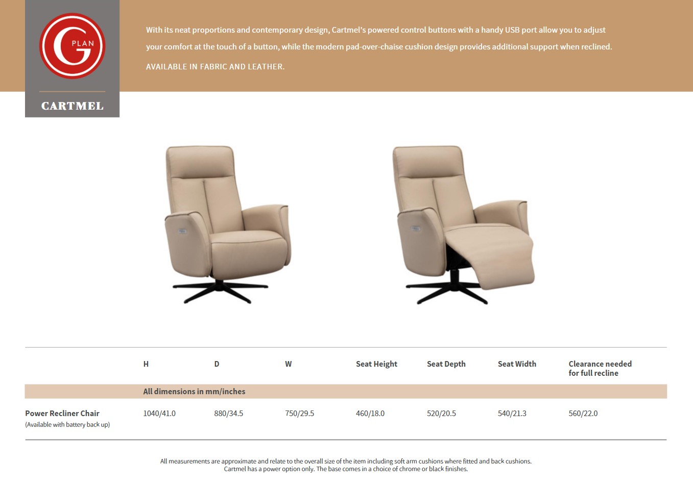 The contemporary and angular design of the Cartmel, coupled with its compact proportions, make it a useful and comfortably addition to almost all shapes and sizes of living room! Deep cushioned and swept arms are ergonomically supportive and cast a handsome shadow. Cartmel is a fully-powered recliner chair with a power-adjustable headrest as well. All function is operated by a sleek and discreet button-pack, mounted to the outside edge of the chair. The backrest has a vertical stitch detail, which promotes fantastic bolster support. This chair really has earned the name 'Ergoform'!