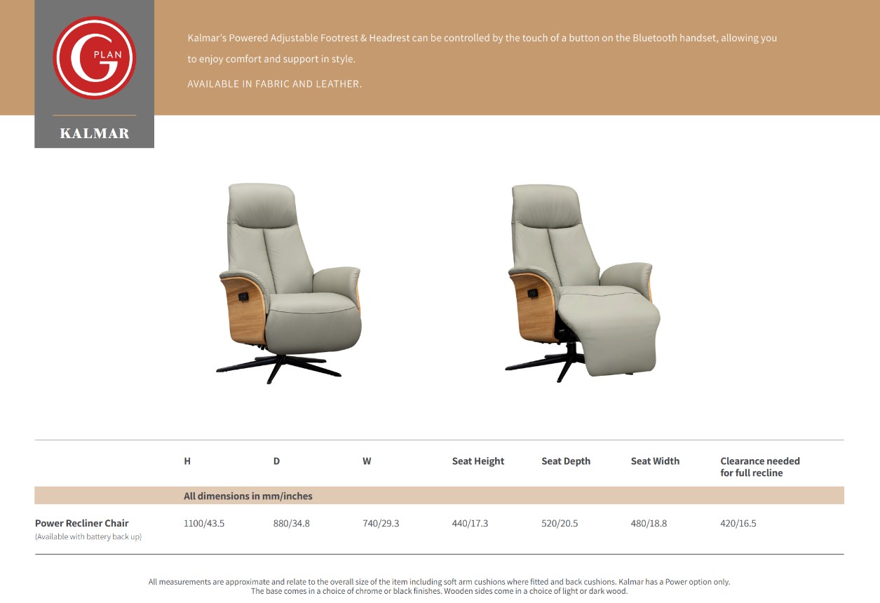 Kalmar is a contemporary recliner swivel chair and a great addition to G Plan's 'Ergoform' range of chairs. Kalmar is a fully-powered recliner chair with a power-adjustable headrest as well. All function is operated by a Bluetooth remote handset, which magnetically attaches to the side of the chair when not in use. The backrest has a vertical stitch detail, which promotes fantastic bolster support. This chair really has earned the name 'Ergoform'! The elegant wooden trim underneath the arms completes this contemporary look, and the choice of light or dark wood tones makes it easy to create a Kalmar Chair ideally suited to your home.