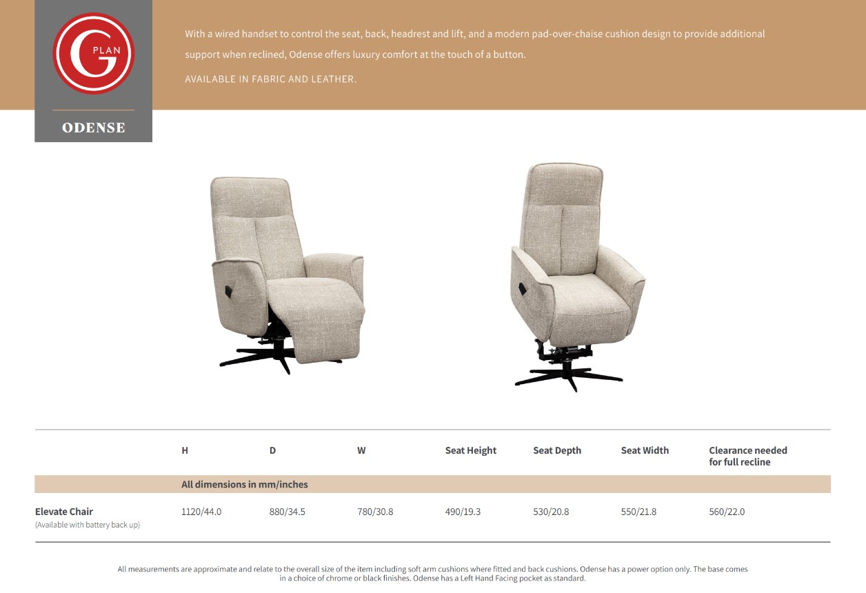 Odense is a wonderfully stylish and discreet reimagination of the traditional lift-rise chair! Styled to look like a modern recliner, Odense has an 'Elevate' function as well, helping those less able in and out of the chair. Not to be confused with a one-trick pony, however, Odense still also reclines in both the footrest and backrest, and is also fitted with an electronically adjustable headrest and a 360-degree swivel function. The backrest is also upholstered with a central stitch detail, which is not only contemporary but also promotes great bolster support.