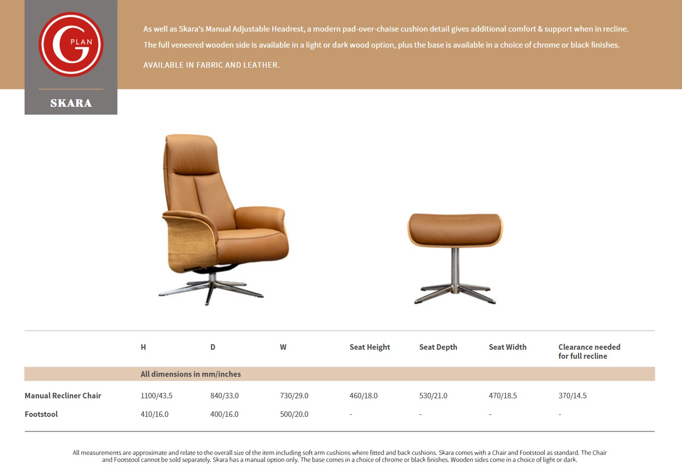 Skara is a contemporary manual-reclining swivel chair and a great addition to G Plan's 'Ergoform' range of chairs. Simply elevate your feet using the raked footstool, marrying perfectly to the profile of the chair. The backrest of the chair reclines by using a gas spring, which is in turn operated by a small lever fitted between the seat cushion and the arm on the inner edge. Skara is also fitted with a 'push-and-pull' manually-adjustable headrest, allowing the user to find optimum comfort as any degree of recline. The backrest has a vertical stitch detail, which promotes fantastic bolster support. This chair really has earned the name 'Ergoform'! The elegant wooden trim underneath the arms and on the footstool completes this contemporary look, and the choice of light or dark wood tones makes it easy to create a Skara Chair ideally suited to your home.