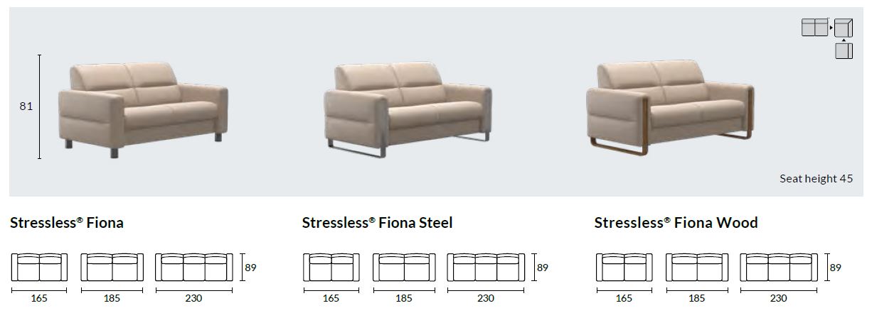 • Choose from a straight or a corner sofa. Fiona is a range from Stressless that gives you full flexibility for your living space! Choose from a 2-Seater Sofa, 2.5-Seater Sofa or 3-Seater Sofa. Or, if none of these are quite right, use individual modules to create a small or large corner unit, maximising every inch of space in your room.