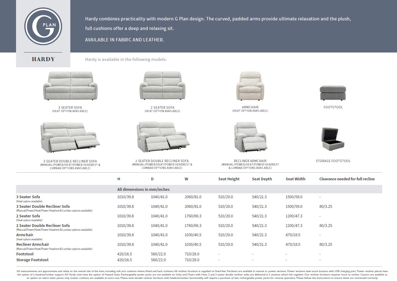 Hardy combines practicality with modern G Plan design. The curved, padded arms provide ultimate relaxation. The plush, full cushions offer a deep and relaxing sit. Hardy benefits from an innovative design with the option of additional headrest and lumbar support for customised comfort on power units. Handy storage footstool option available. Choose from a range of beautiful fabrics and leathers to suit your style.