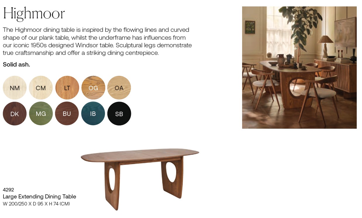 The Highmoor Dining Table is a striking modern table with retro undertones and will make a statement in any home. Circles are sculpted into the legs showing the craftsmanship of this table, which gives a quintessentially 'Ercol' feel to the furniture. The dining table is made of solid ash and can sit with any of the ash chairs in the Ercol collection. When closed this table seats 6 and easily extends to seat 6-8 people, giving the ability to host more guests. When not in use, the leaf stores neatly within the table. The Highmoor Extending Dining Table is available in all Ercol ash finishes.