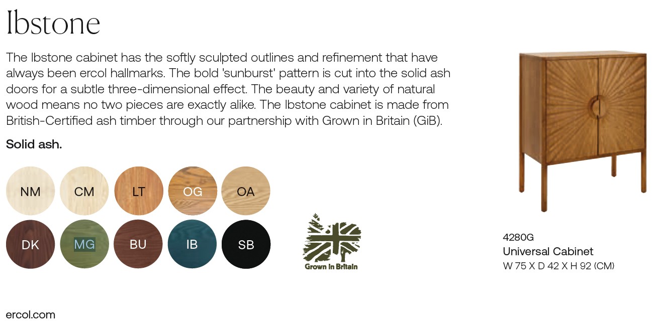 A beautiful statement piece, the Ibstone Cabinet has the softly sculpted outlines and refinement that have always been Ercol hallmarks. The bold ‘sunburst’ pattern is cut into the solid ash doors for a subtle three-dimensional effect, with a central disc handle set in a gently dished recess. Each individual piece has its own unique quality and look, reflecting the beauty and variety of natural wood grain. This Universal Cabinet is compact enough to provide additional storage through out the home. Supplied fully assembled, it’s available in all ash finishes, including Ercol's Vintage stain, a homage to the wood colours that made them a household name!