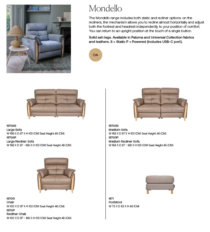 Named after a beautiful coastal village in northern Sicily, Ercol's Mondello Collection of sofas, armchairs and a matching footstool is the ultimate in comfort. This range has a classic appeal and it allows you to recline effortlessly. It includes both static and recliner options: on the recliners, the Mondello mechanism allows you to recline almost horizontally and adjust both the footrest and headrest to your position of comfort. You can return to an upright position at the touch of a single button; there is even a USB port for extra convenience. All Mondello pieces are available in fabrics and leathers from Ercol's 'Paloma' and 'Universal' collections.