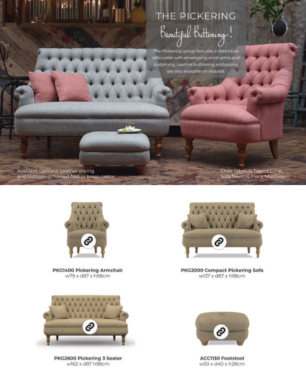 The Pickering Collection is a stalwart part of the Wood Bros upholstery catalogue! This is a versatile and compact range, ideally-suited to smaller and more traditional homes. That said, we quite often sell the armchair as an occasional seat for an alcove or bedroom, as well as part of a larger living room suite of furniture. The deep buttoning to the backrest is highly distinctive and comes with the option of a leather trim on the buttons themselves. Meanwhile, for the most part, you have a fabulous choice of fabrics and leathers, including antiqued leathers and Harris/Moon tweeds! The level of construction and upholstery is hard to find anywhere else and, as such, we covet Wood Bros products highly!