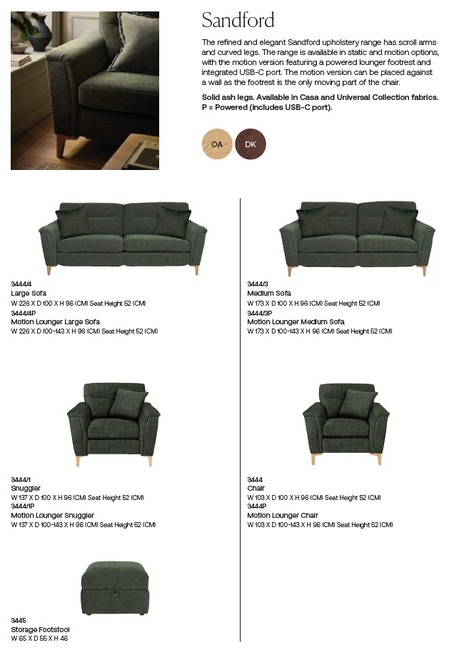 The refined and elegant Sandford upholstery range has modern scroll arms and curved legs. The range is available in static and motion options, with the motion version having a USB port. The Sandford Collection comes in a range of sizes to suit any space and a unique collection of model-specific fabrics! The gently outward rounded arms complement the curved ash legs, showcasing Ercol’s prowess for design and quality.