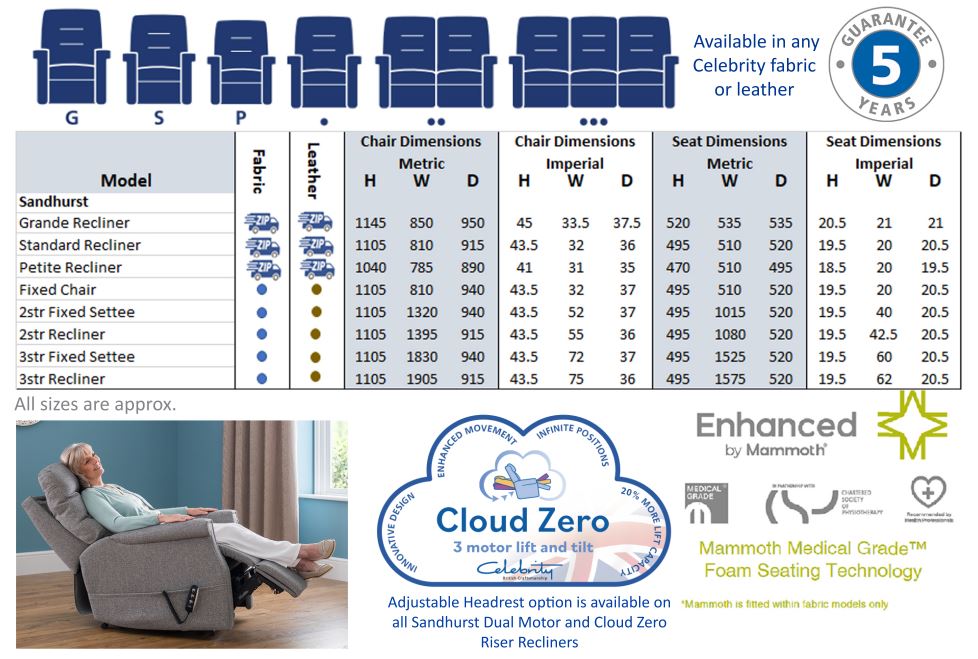 - All fabric Sandhurst models are fitted with Mammoth Medical Grade Foam Seating Technology as standard, which helps to promote healthy circulation and avoid any areas of pressure build-up.
