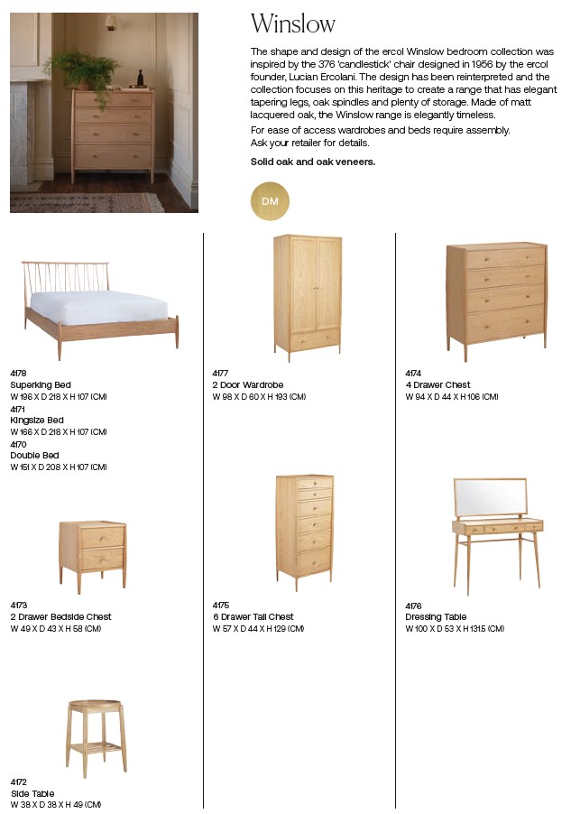 The shape and design of the Ercol Winslow Bedroom Collection was inspired by the 376 candlestick chair, first designed in 1956 by Lucian Ercolani. Winslow harnesses Ercol's design heritage to create a range that has tapering legs, oak spindles and plenty of storage. Beautifully crafted from solid oak and oak veneers, Winslow is presented in a contemporary matt lacquer finish and features traditional dovetail joints on drawers and finger joints for extra strength.